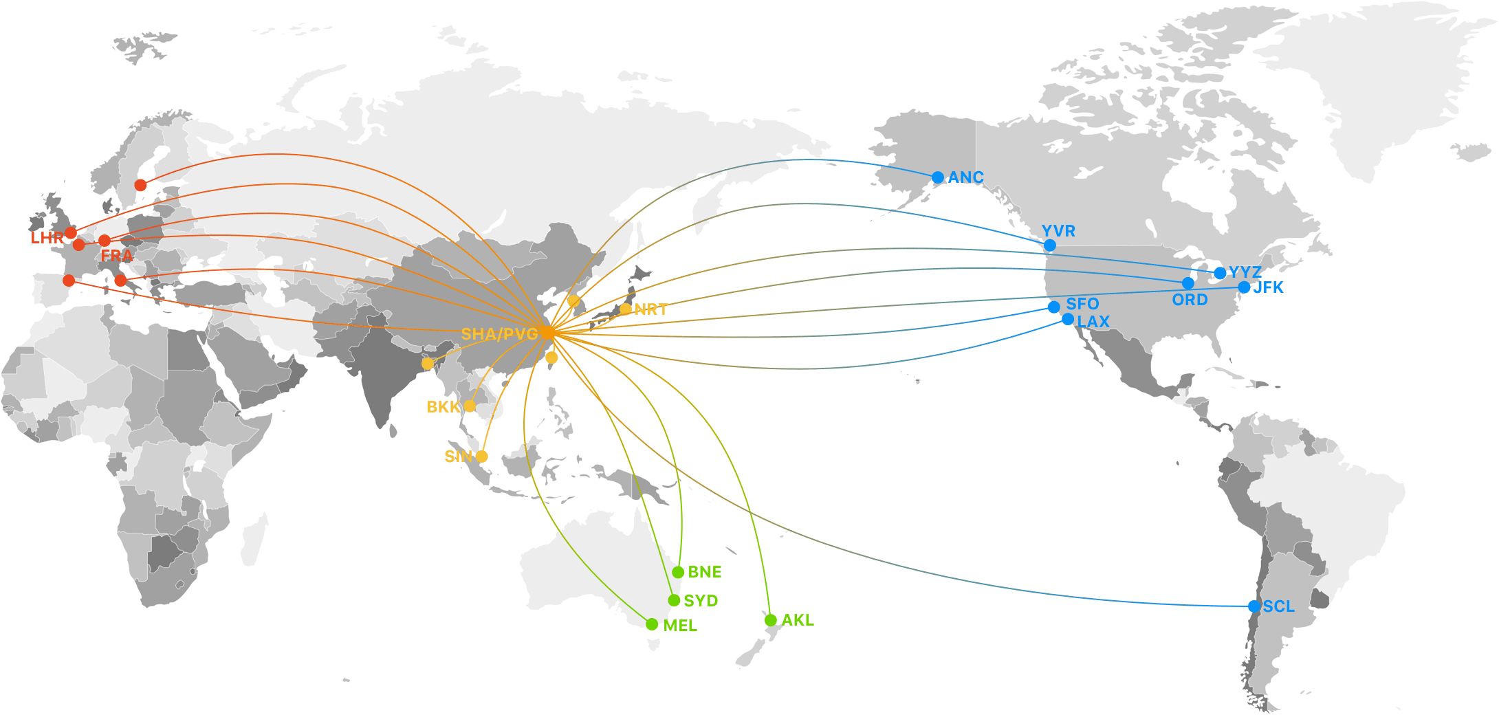 十余架全貨機(jī)和700多架客機(jī)腹艙資源,依托天合聯(lián)盟、代碼共享與SPA協(xié)議,航線網(wǎng)絡(luò)通達(dá)全球170個(gè)國(guó)家和地區(qū)的1036個(gè)目的地。